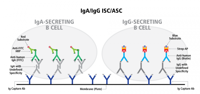 This ImmunoSpot® kits contains PVDF-membrane plates, diluents, capture antibody, detection reagents, colorimetric substrates and polyclonal B cell stimulator (B-Poly-SE™) capable of eliciting IgE+ antibody-secreting cells (ASC)